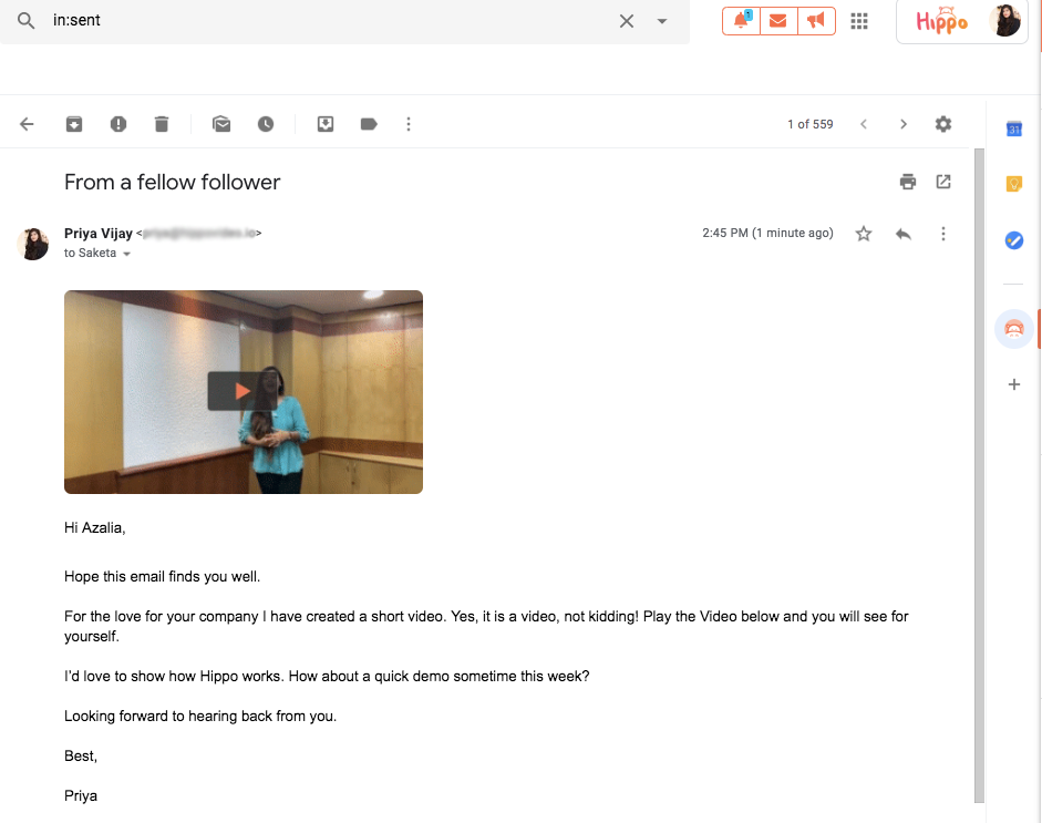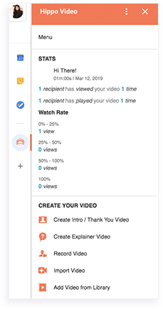Record engaging video emails and send them to your prospects/leads via Hippo Video’s Gmail Add-on or Hippo Video’s Chrome extension. Build a warm relationship with your prospects through personalized videos and get the attention you deserve.